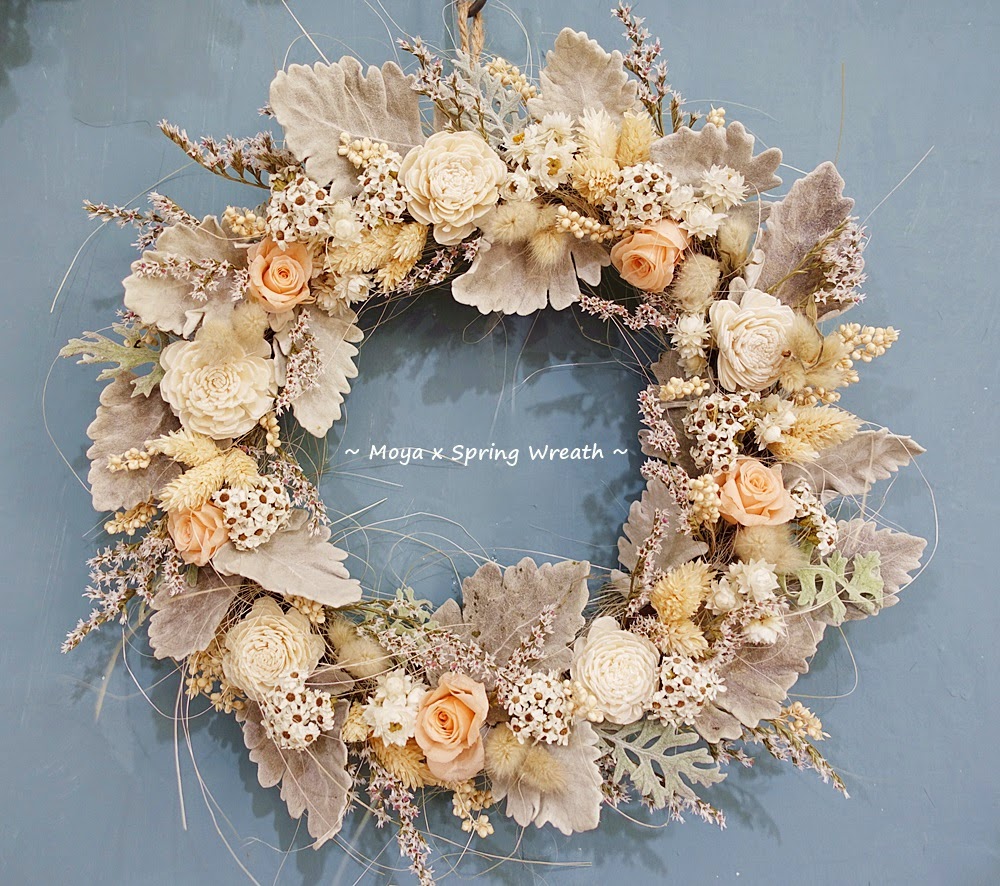最後將細碎小花材補滿,用補血草拉出非常美麗的線條,我的花圈就超浪漫地完成了