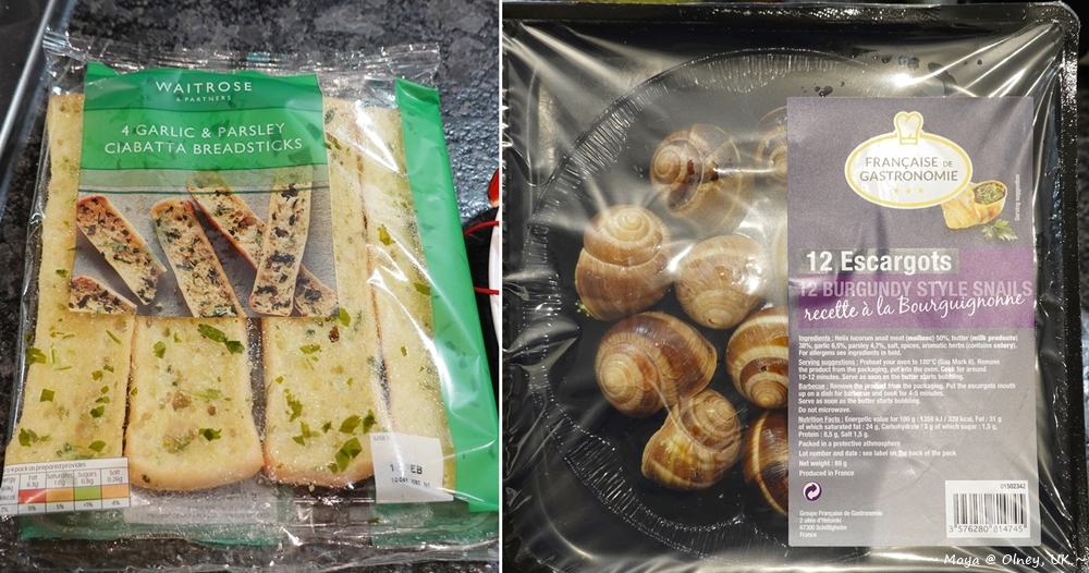 我在Waitrose超市買了兩隻加拿大的冷凍龍蝦,就順便再挑了一盒法式蝸牛、一包義式大蒜巧巴達、半份豬肋排,就決定來弄個海陸大餐,而且全部都用一個烤箱就可以40分鐘內一口氣完成!