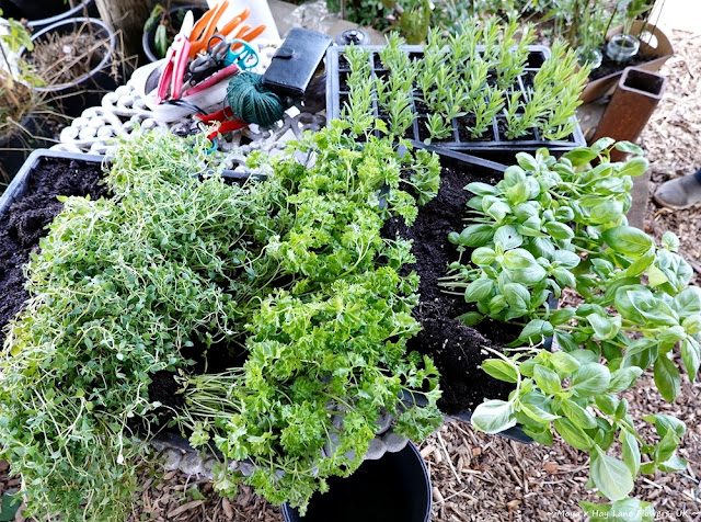 然後再把一些在育苗盒裡正在長大的羅勒、香菜、百里香、跟其他我也不知道叫什麼的種進土裡。