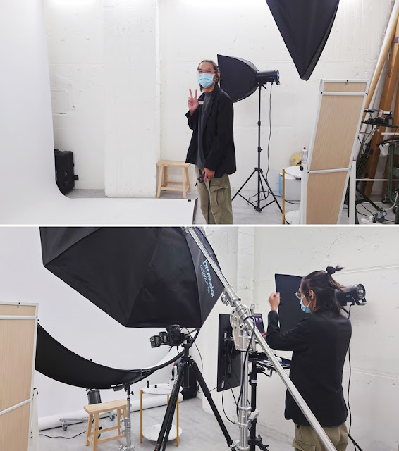 拍完專業照後接著換背景跟道具拍證件照。證件照很麻煩,除了拍正面之外,還要特別把頭髮梳乾淨放耳後拉住露出耳朵,兩耳都補拍之後要去合成的。我就是天生耳朵很貼的人,真的不懂這是什麼鳥規定。(之前在外面相館就是死命把頭髮往後梳露出大臉跟耳朵,所以都醜死了,這邊就是用補的方法,有人性多了~)